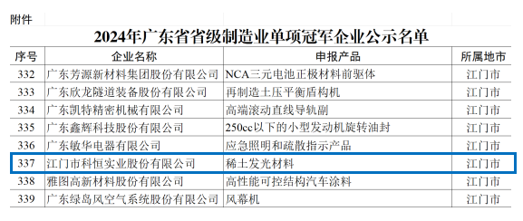 2024年7月,科恒股份獲廣東省制造業單項冠軍企業。